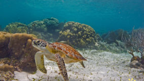 As we move up the north wall, we see a countless variety of fish as they either traverse the coral, or clump together in huge schools, such as the yellow snappers and blue tangs. Soon we catch sight of a sea turtle whose shell glistens as it surfaces for a quick gulp of air before diving again to dine on turtle grass.
