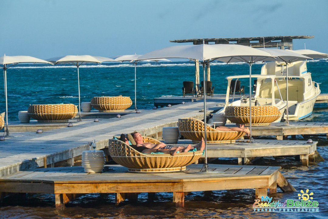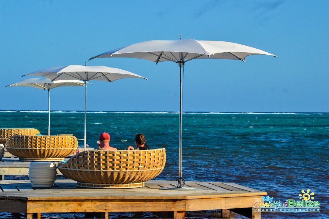 A handful of private umbrellaed seating pods line both sides of the dock where guests can enjoy the sun, sea breeze and peaceful Caribbean view. Wait staff keeps the food and cocktails coming while the day is spent lazing in overstuffed lounging baskets big enough for two.