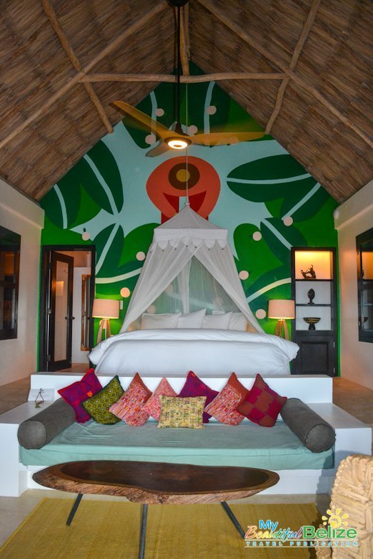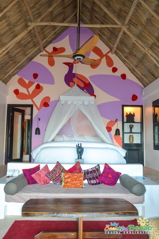 The guest cabañas have also seen a transformation, from a classic palette of white with color accents to a bold pop of color. Bright with lush tones and soft pastels, tropical murals created by illustrator Cécile Gariépy adorn the room’s highest wall at the head of the bed. Using imagery that tells a story, the effect is stunning, with color accents taken from the mural added to other décor within the room. The ambiance is warm and sexy, a perfect island retreat to be shared with the one you love!