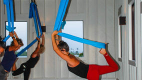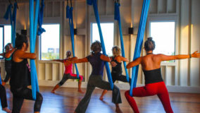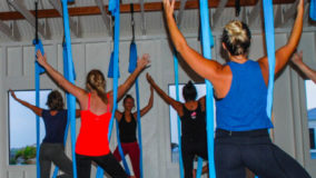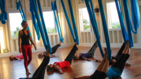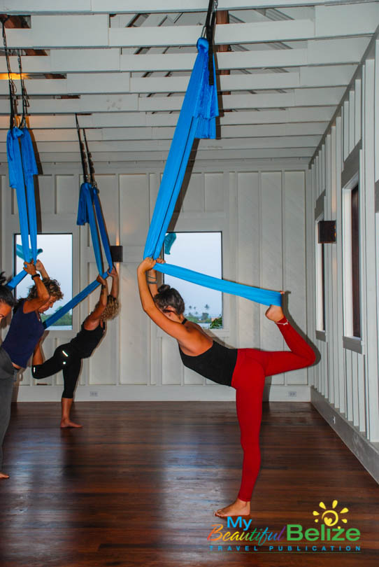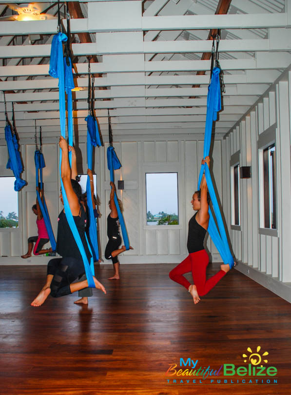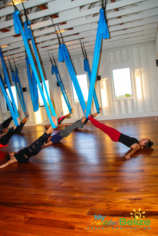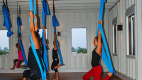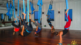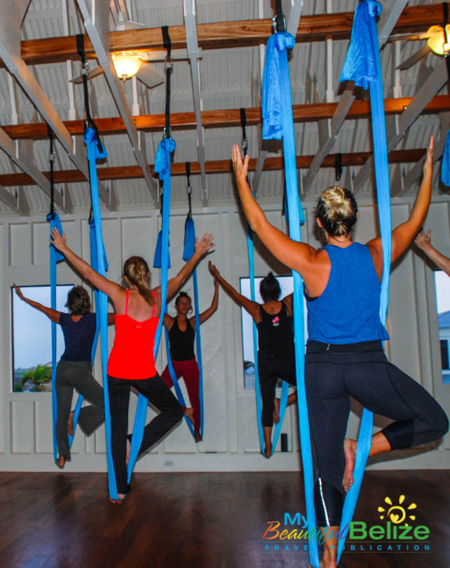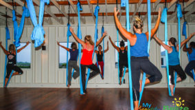 Swathes of silky turquoise material hang from beams at the Science and Soul Wellness studio – Paulette Harwood’s magnificent aerial yoga space located at Mahogany Bay Village. It’s where I joined several others in my first attempt at suspended yoga.
