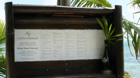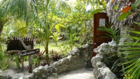 Our afternoon lunch at Aji began with a quick boat ride from town on the Coastal Xpress. After alighting at the dock, heading to the beach, a sign indicates we are in the right area. As we get closer, we see organic décor, using live trees, local beach-worn rock, and shells, all combined to create a wonderfully inviting entry to the restaurant. A short winding path leads us to the thatched palapa where we meet the lovely Victoria Wolski, one of the owners of the restaurant.