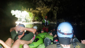 After being completely taken away by the rappelling, Edgar led us into the cool waters of the river that was less than a minute away. We thought it couldn’t get any better, after the zip lining and cliff rappelling, but it did.We splashed through water with inner tubes on our backs, to the mouth of Xibalba (Pronounced: shi-bal-ba). To the Maya that once inhabited these ancient grounds, caves were believed to be the entrance to “Xibalba,” the Maya hell. It was believed that all souls, after death came to Xibalba and in order to be re-born had to overcome the different challenges that awaited them in this “place of fright.” Inner tubes connected, we made our way into the mouth of the eerie cave, currents leading us into the heart of what to the Maya was “hell” itself. It was pitch dark, and silent, the only light of course, came from our headlights, which illuminated just bright enough to see the incredible stalactite and stalagmite formations and the tremendous caverns of this sacred cave.