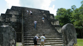 But our destination does not lie within the boundaries of Belize. The Tikal Temple is located in our neighboring country of Guatemala in the districtof Peten. The driver drops us off at the Santa Elena border, where we get our passports stamped and cross over to Guatemala where we meet Samuel Elias a very knowledgeable and local tour guide of Tikal.