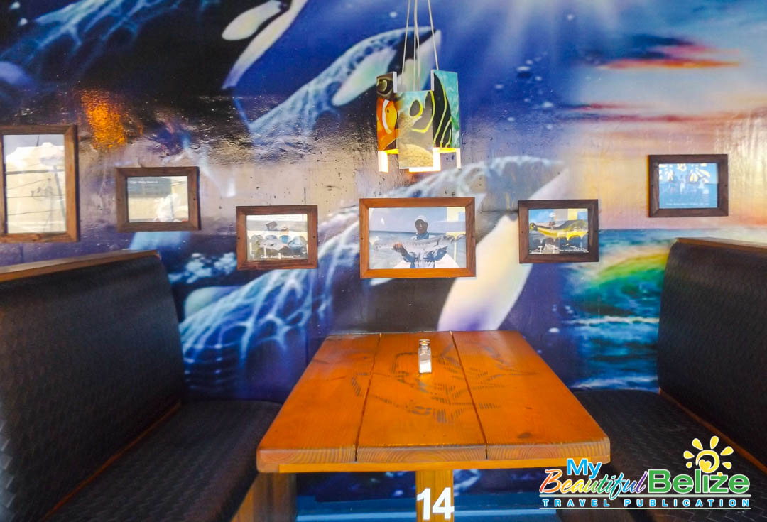 Anglers certainly is unique, with an underwater theme depicting the marine world throughout the establishment. The floors feature different types of fish, and beautiful fish images airbrushed by Marin adorn the counter of the well-stocked bar. Anglers Restaurant and Bar counts with several flat screen TV’s throughout the restaurant for viewing pleasure.
