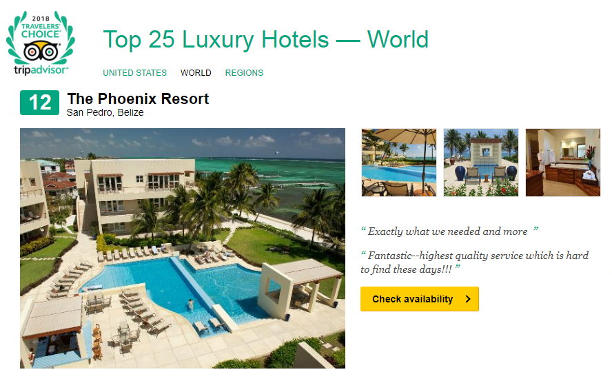 The Phoenix Resort in San Pedro, Ambergris Caye also made a splash once again. The resort placed 12th on the top 25 Luxury Hotels in the World Category and placed 2nd on the Top Ten Luxury Hotels in the Central America category.