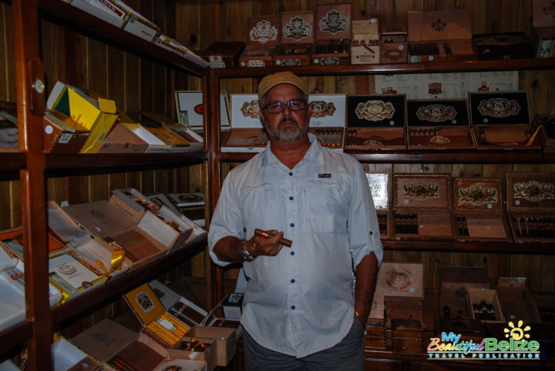 At the sight of so many boxes of cigars, I felt like a little boy in a candy shop, tempted to sample them all! With Utrera’s assistance, I chose one, and with my decision made it was time to head to the well-stocked bar, where coffee, whiskies, wines, and Belizean rums awaited to accompany my tobacco.