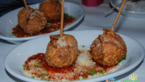 Each new addition to the canvas before us required a quick stop to let the paint dry, and each time, waitresses would come by plying us with delicious treats that Judyann and Hortense sent from the kitchen. Clouds, then stars, the moon and its reflection, and finally, some palm leaves/trees took shape under our brushstrokes, while appetizer after appetizer kept coming as well. From warm, comforting Seafood bisque with shrimp bites, to fresh Snapper Samplers, sweet Teriyaki Chicken and totally fun (and delicious) Lasagna meatball samplers with marinara sauce, our taste buds were very happy!