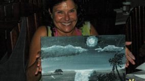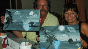 What I was actually doing was sitting at Black Orchid Restaurant, enjoying its fabulous ambiance and listening to Melody Sanchez-Wolfe’s instructions on recreating one of her pieces: a full moon over the water, framed by palm trees in silhouette, and a dock with a palapa in the foreground. My artist pal Monique had joined me for drinks and delicious appetizers, and between the two of us, we hoped to come up with something worthy of display. I mean, I failed Art in junior college. I hear no-one fails art, but I think we all know I’m special…(ha!) so between the two of us, there should be something worthy of display, right?