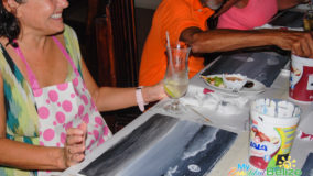 But back to the class: Splash ‘n’ Paint is a super-fun experience that is led by Melody, a local artist and gallery owner. She has been offering these classes on the island for a while, alternating between Feliz Bar across the bridge, and Crazy Canucks in town. Those wanting to try their hand at painting and possibly make their own souvenir can join in on the classes. What’s not to love about getting to be creative, especially when you can add drinks and snacks to the mix! Throw in the possibilities of meeting new people or reconnecting with friends on a regular basis, while doing something so enjoyable, well, it’s no wonder the classes are so popular!