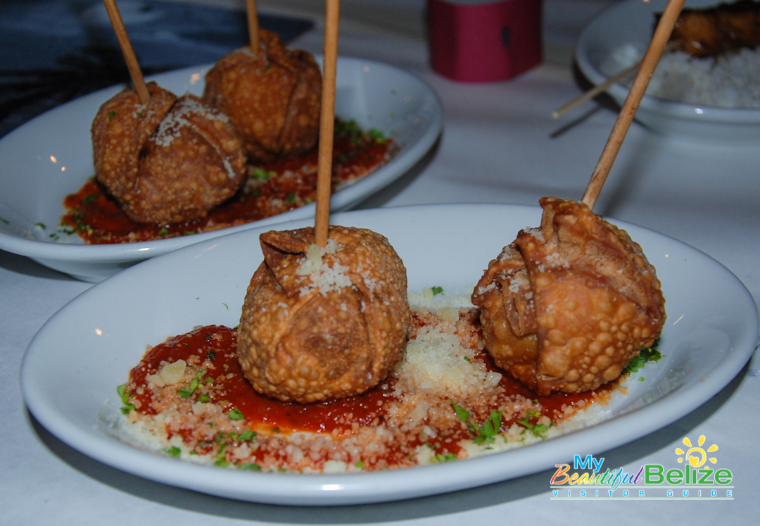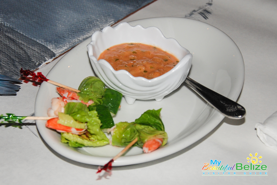 Each new addition to the canvas before us required a quick stop to let the paint dry, and each time, waitresses would come by plying us with delicious treats that Judyann and Hortense sent from the kitchen. Clouds, then stars, the moon and its reflection, and finally, some palm leaves/trees took shape under our brushstrokes, while appetizer after appetizer kept coming as well. From warm, comforting Seafood bisque with shrimp bites, to fresh Snapper Samplers, sweet Teriyaki Chicken and totally fun (and delicious) Lasagna meatball samplers with marinara sauce, our taste buds were very happy!