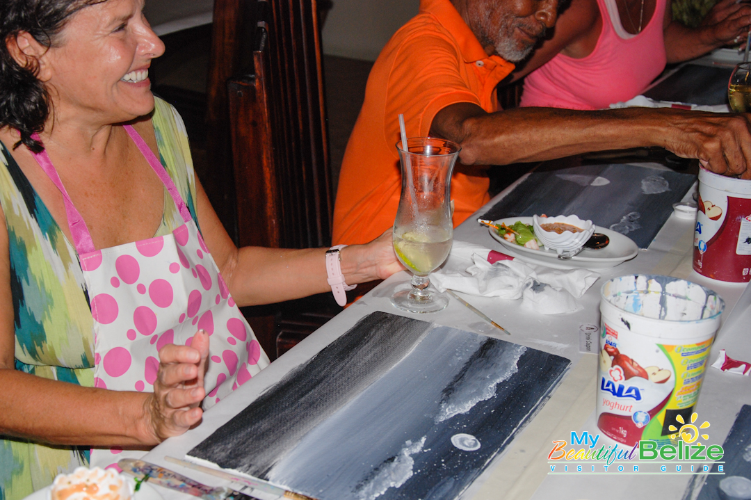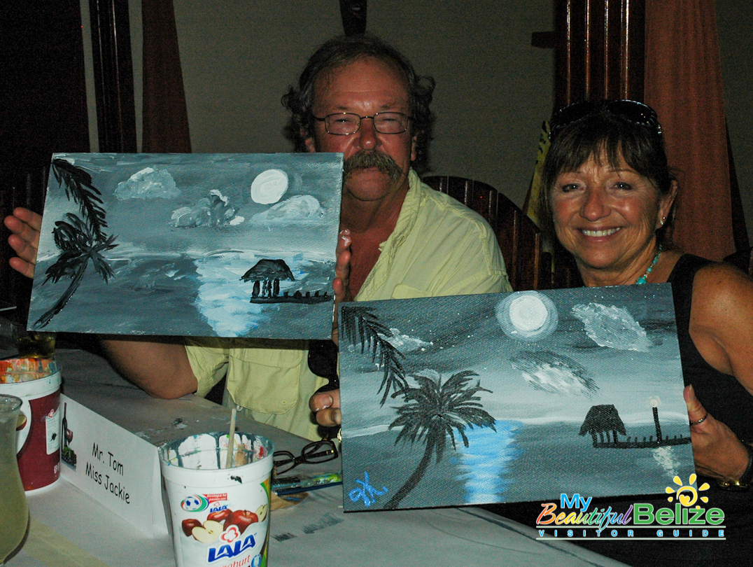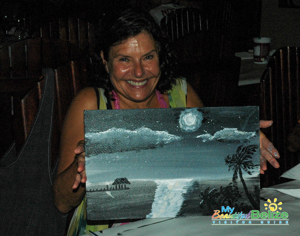 But back to the class: Splash ‘n’ Paint is a super-fun experience that is led by Melody, a local artist and gallery owner. She has been offering these classes on the island for a while, alternating between Feliz Bar across the bridge, and Crazy Canucks in town. Those wanting to try their hand at painting and possibly make their own souvenir can join in on the classes. What’s not to love about getting to be creative, especially when you can add drinks and snacks to the mix! Throw in the possibilities of meeting new people or reconnecting with friends on a regular basis, while doing something so enjoyable, well, it’s no wonder the classes are so popular!