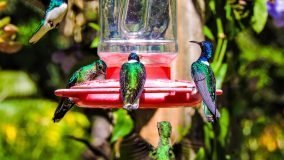From the enclosed pavilion, we move outside to a covered patio where they have created a hummingbird viewing area complete with seating and bird identification books. Using nectar feeders and natural foliage to attract these super-fast dynamos, several types of colorful hummingbirds compete for the food and thoroughly entertain the guests. Photo opportunities are endless, and once again the area begs you to stay and enjoy these darting darlings!
