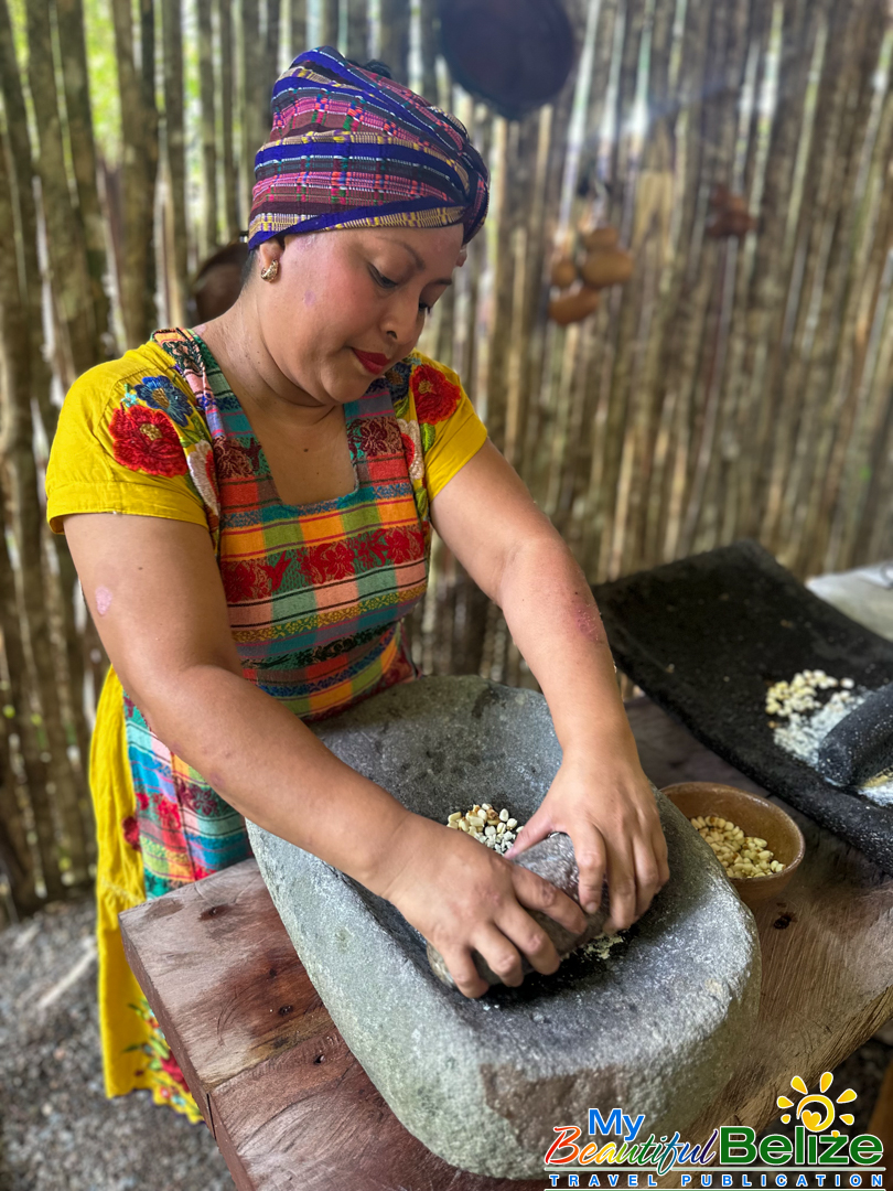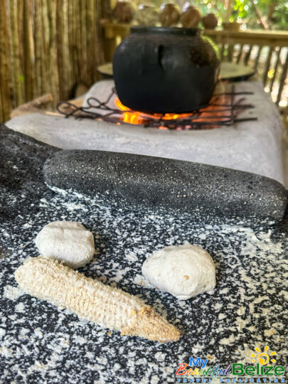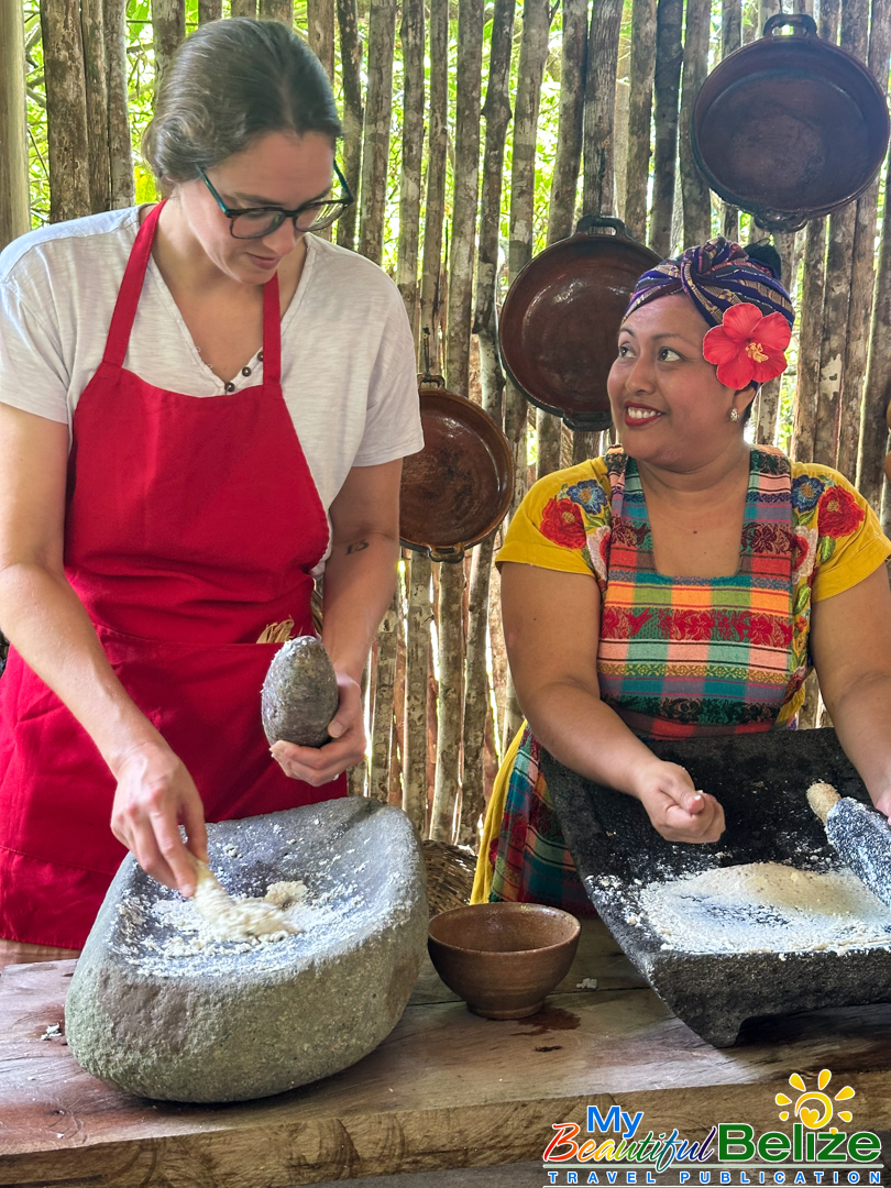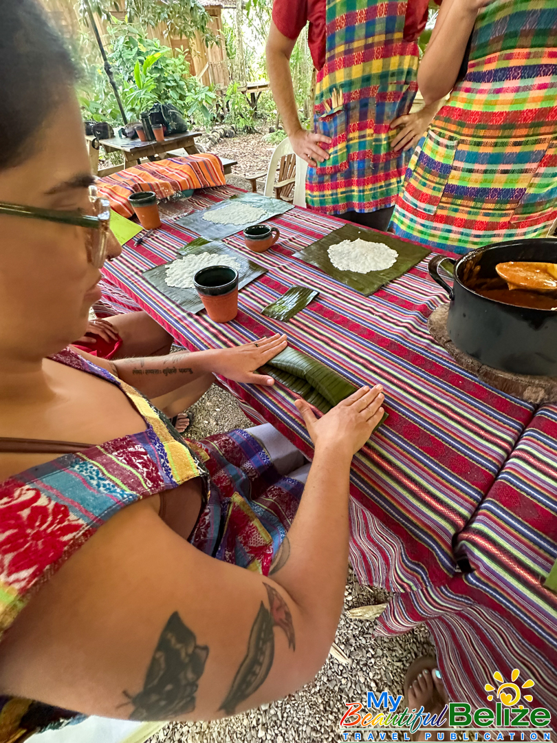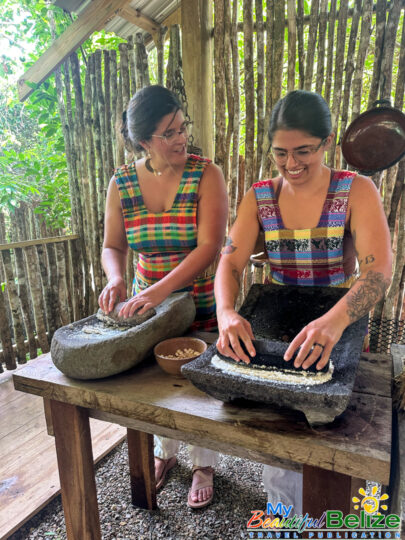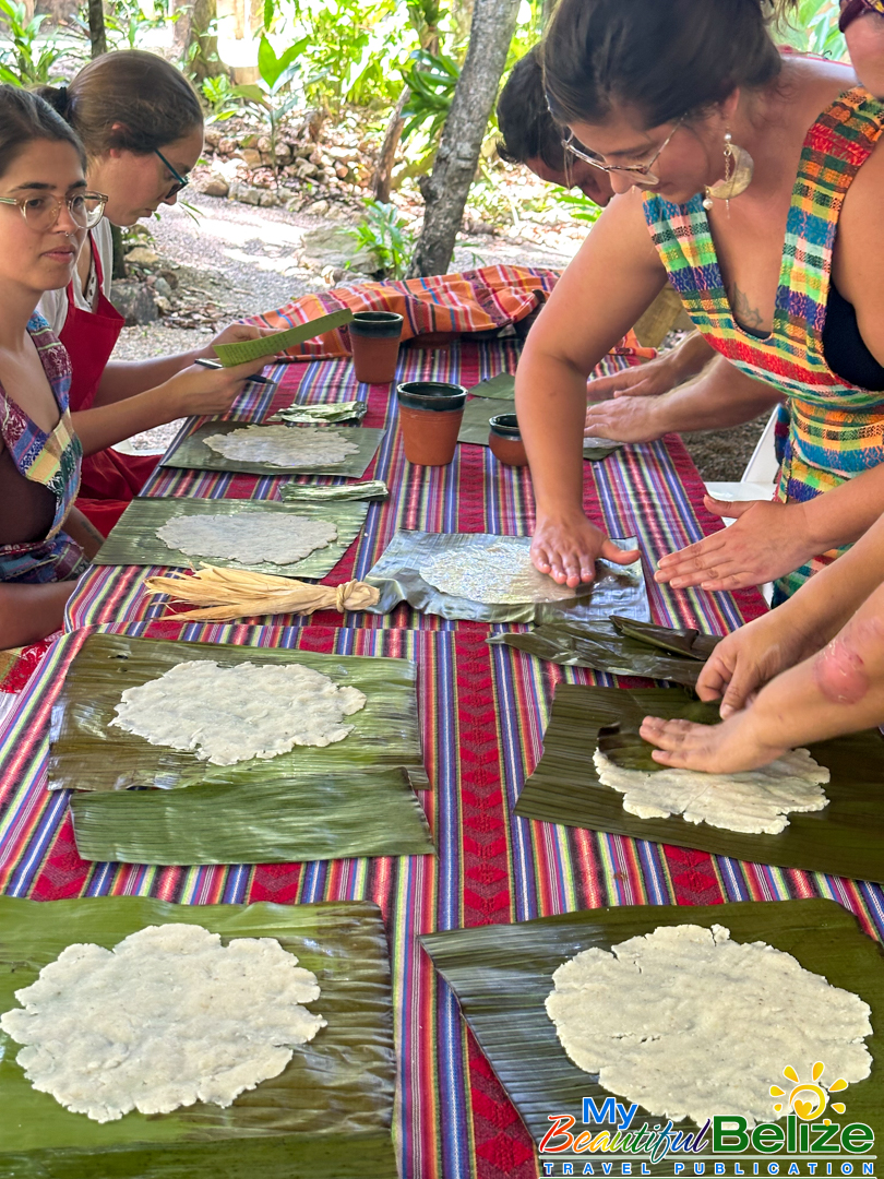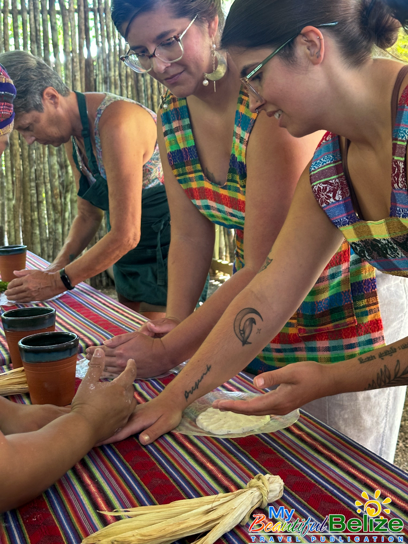Next, we shell the hard kernels from the cob, winnow the chaff, (gently tossing the corn kernels in a basket to remove the outer seed coverings) and then grinding the corn (after it’s been boiled in food-grade lye) by hand with a stone “mano y metate” (mano is the handheld stone used for grinding, while the metate is the larger, stationary stone with a concave surface against which the mano is worked) until a soft “masa” dough forms. As we go about our prepping, Steph shares stories about Maya traditions and how food plays a central role in community life, ceremonies, and family gatherings. We even learn the lively Corn Dance, as Steph engages us in the moves while multitasking and tending to the open-hearth fire. The air fills with the scent of roasting corn and wood smoke, the hallmark fragrance of a Maya kitchen.