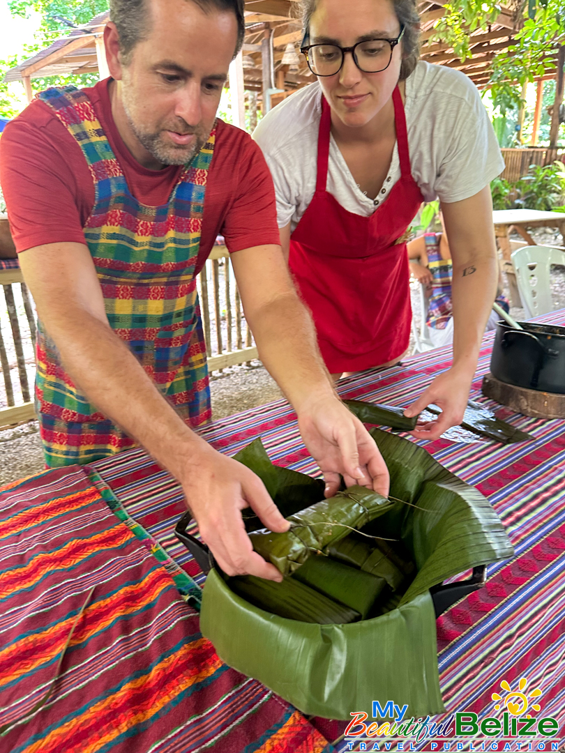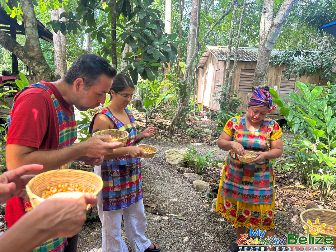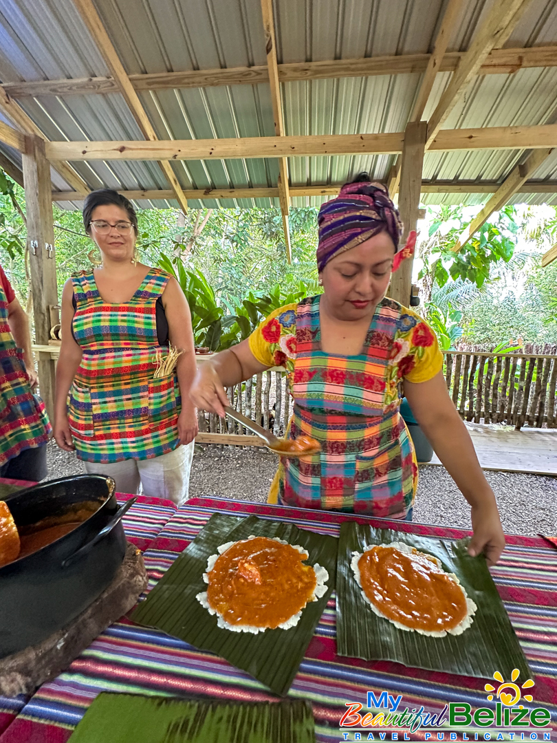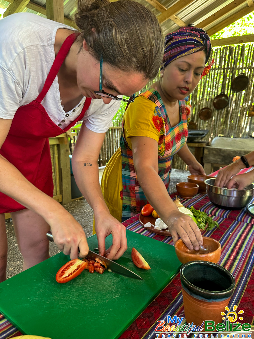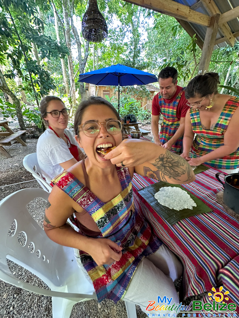 Next, we shell the hard kernels from the cob, winnow the chaff, (gently tossing the corn kernels in a basket to remove the outer seed coverings) and then grinding the corn (after it’s been boiled in food-grade lye) by hand with a stone “mano y metate” (mano is the handheld stone used for grinding, while the metate is the larger, stationary stone with a concave surface against which the mano is worked) until a soft “masa” dough forms. As we go about our prepping, Steph shares stories about Maya traditions and how food plays a central role in community life, ceremonies, and family gatherings. We even learn the lively Corn Dance, as Steph engages us in the moves while multitasking and tending to the open-hearth fire. The air fills with the scent of roasting corn and wood smoke, the hallmark fragrance of a Maya kitchen.