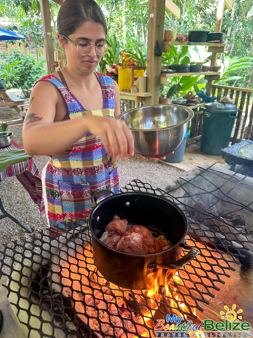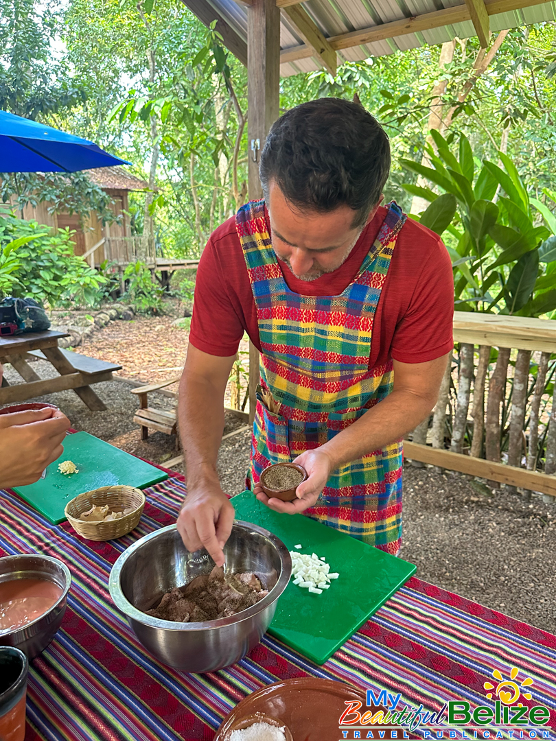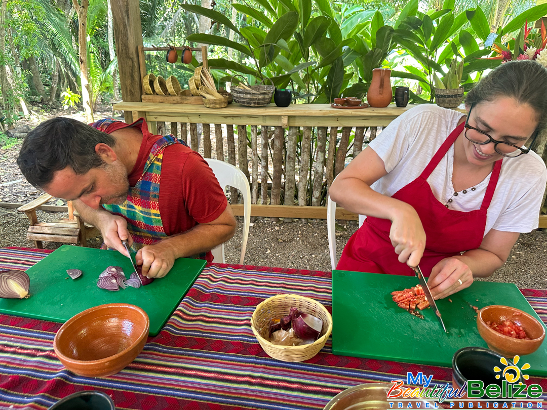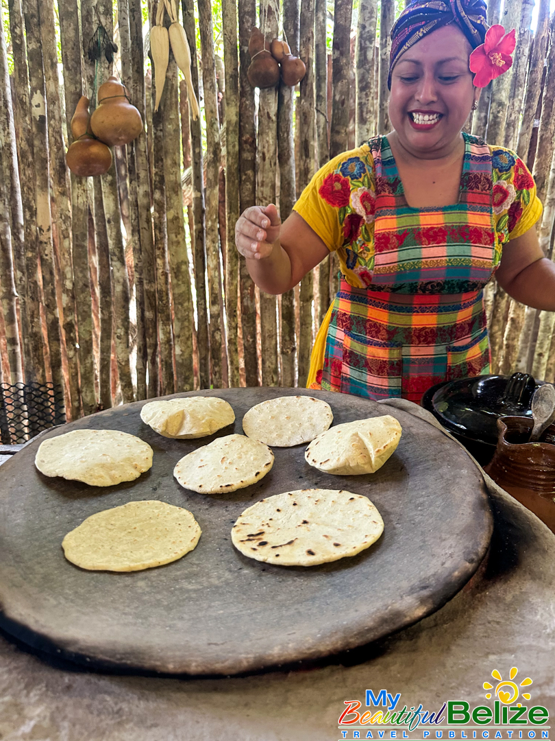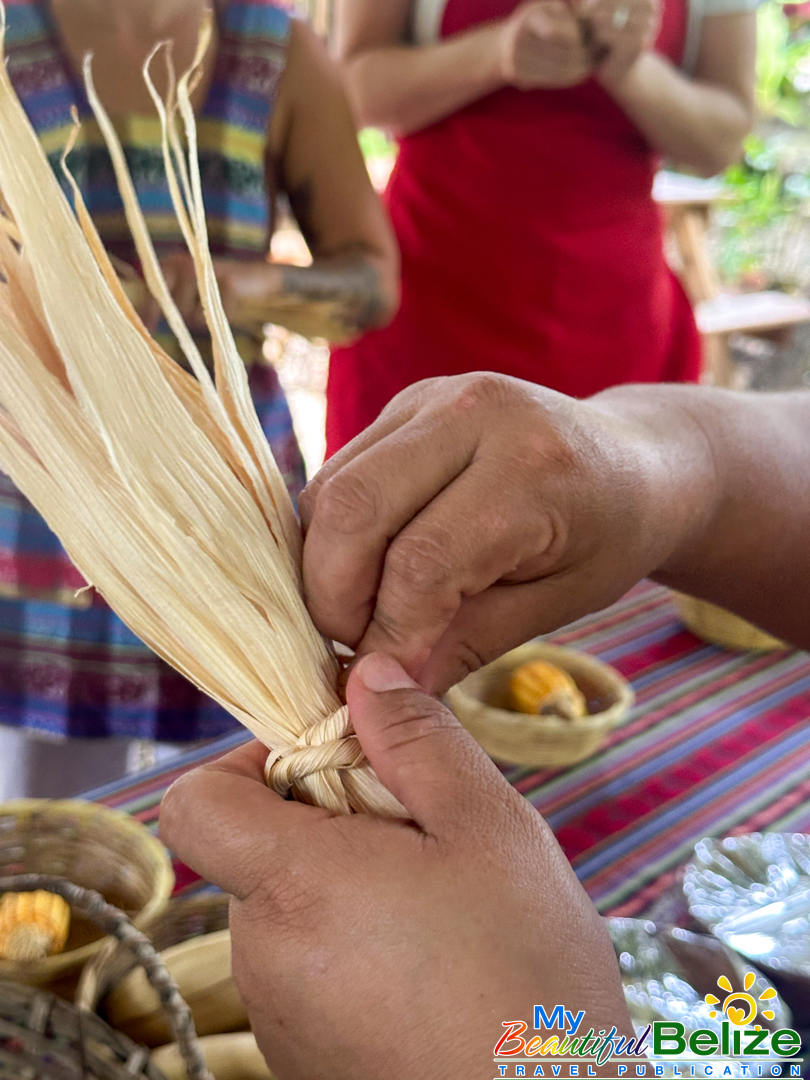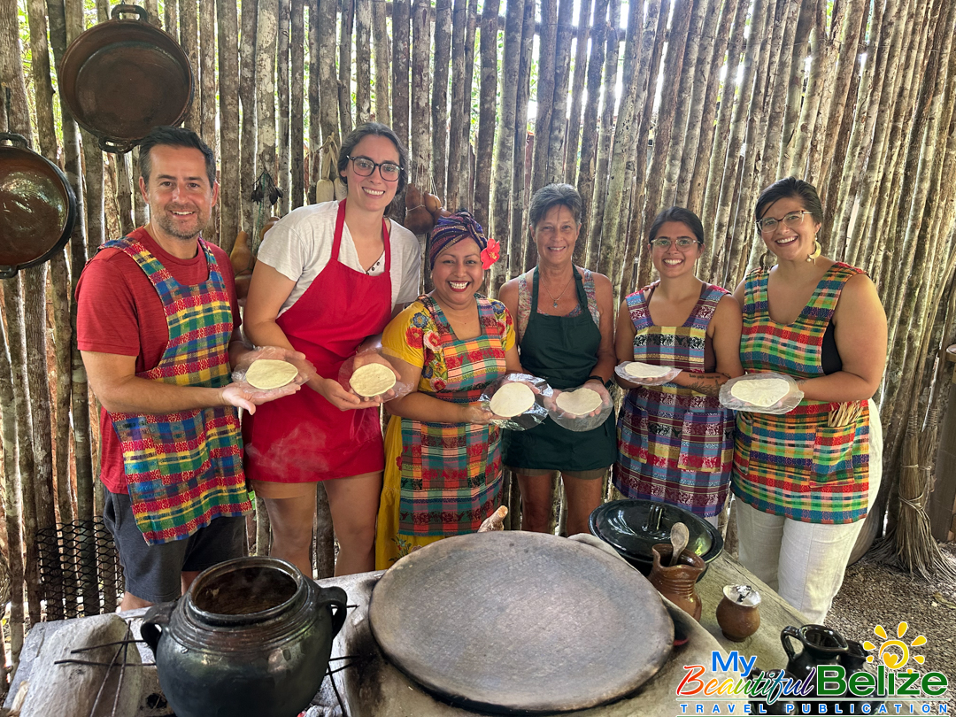 Next, we shell the hard kernels from the cob, winnow the chaff, (gently tossing the corn kernels in a basket to remove the outer seed coverings) and then grinding the corn (after it’s been boiled in food-grade lye) by hand with a stone “mano y metate” (mano is the handheld stone used for grinding, while the metate is the larger, stationary stone with a concave surface against which the mano is worked) until a soft “masa” dough forms. As we go about our prepping, Steph shares stories about Maya traditions and how food plays a central role in community life, ceremonies, and family gatherings. We even learn the lively Corn Dance, as Steph engages us in the moves while multitasking and tending to the open-hearth fire. The air fills with the scent of roasting corn and wood smoke, the hallmark fragrance of a Maya kitchen.