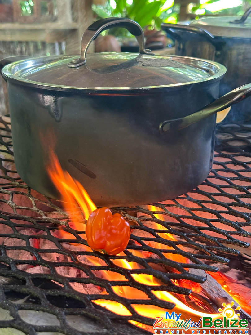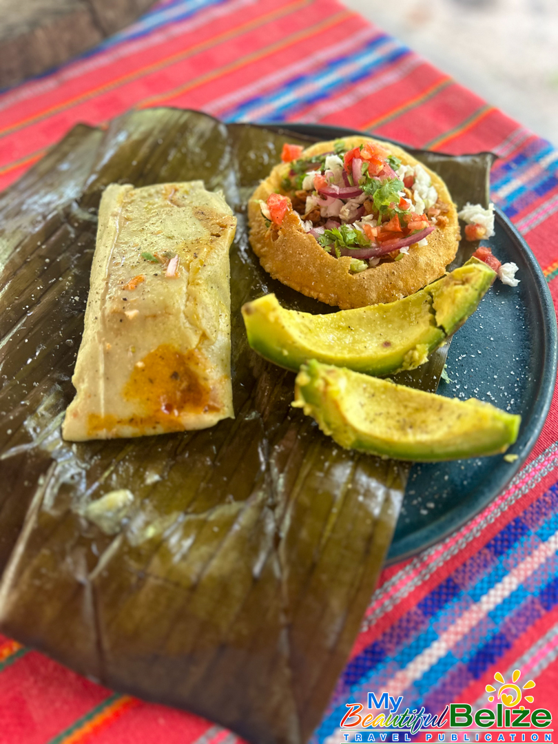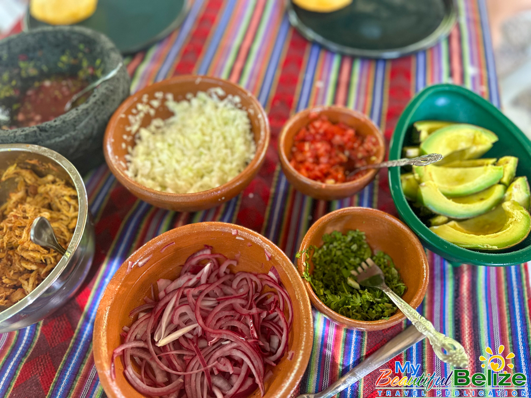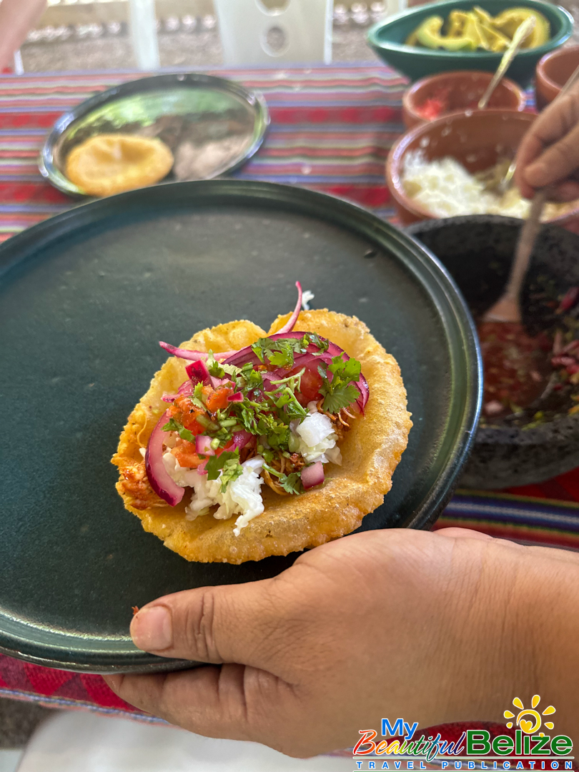 Beyond the laughter and storytelling that fill the open-air kitchen, there’s a deeper purpose. Stephanie’s classes preserve ancient knowledge that was once passed only from mother to daughter, ensuring it continues to nourish both Maya families and curious travelers. After a few hours of shelling, grinding, kneading, chopping, pressing, wrapping, seasoning, and a little dancing, we are the proud chefs of tamales wrapped in banana leaves, filled with stewed chicken in a creamy k’óol, and puffy, crisp salbutes toasted on a hot comal over the open fire (a flat, round griddle made of cast-iron or pottery), mounded with shredded stew chicken and a variety of toppings and spicy, fire-roasted habanero salsa we’ve prepared.