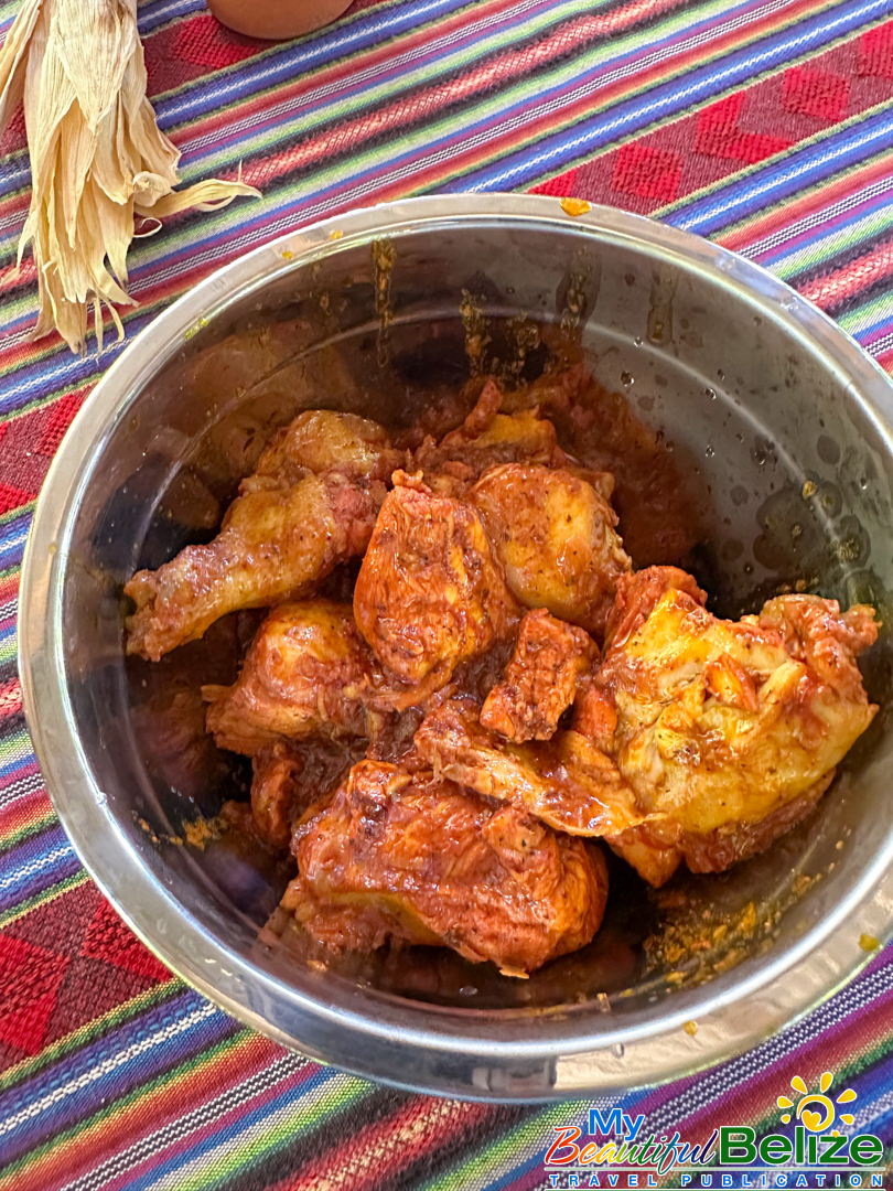 Corn masa is the soul of Maya cuisine, and from it, many dishes are made. After taking some additional steps for each dish, we form small balls from the dough, which we later press flat to form salbutes. Some of the masa is diluted with broth and cooked to the consistency of mashed potatoes, which, once cooled, is used in the tamales. Meanwhile, some masa is added to thicken the broth of the delicious chicken stew we prepare, creating the creamy “k’óol” that’s part of the tamale filling.