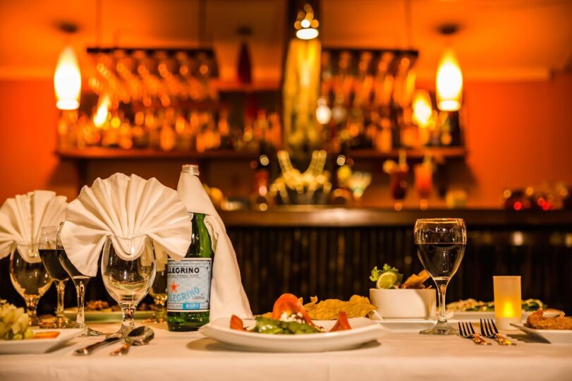Specializing in Latin American and Caribbean Cuisine, you dine romantically by candlelight, in the sultry tropical air under an exotic hardwood roof set off by bamboo, mahogany, and cabbage-bark wood.