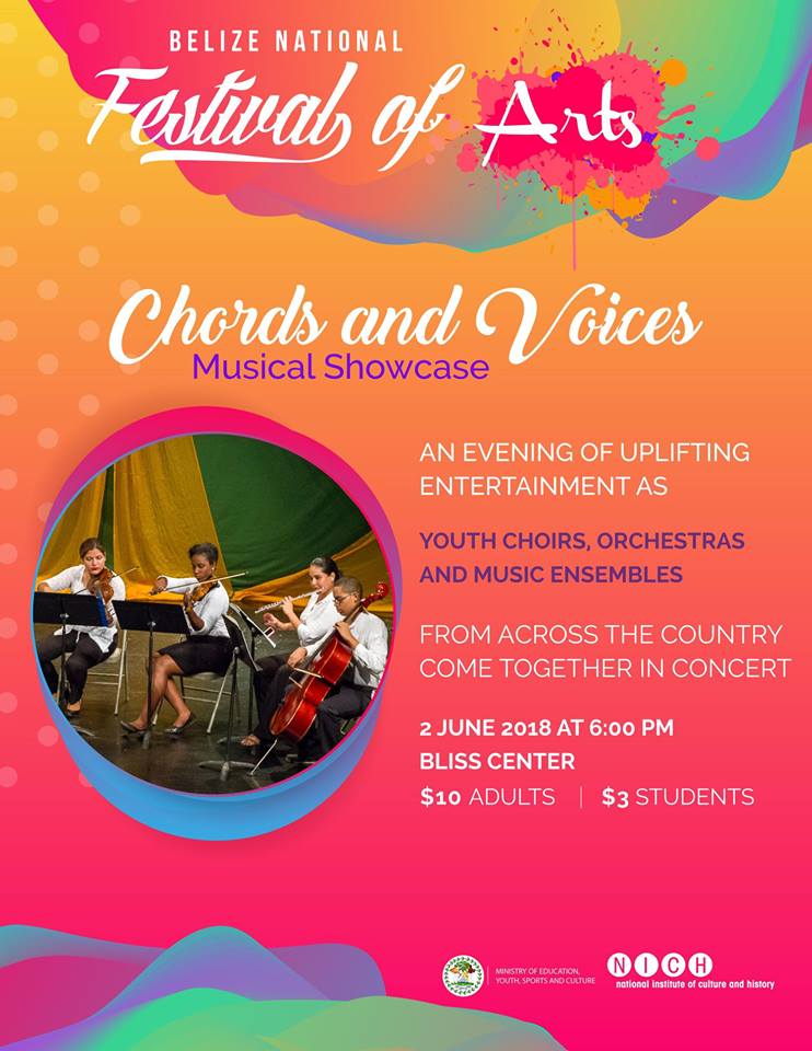 This event has passed. Chords & Voices Musical Showcase June 2, 2018 @ 6:00 pm - 10:00 pm | $10 « All Events Pinterest Twitter Facebook Pinterest Twitter Facebook Add to calendar Google Calendar iCalendar Outlook 365 Outlook Live Details Date: June 2, 2018 Time: 6:00 pm - 10:00 pm Cost: $10 Event Category: Concert Organizer National Institute of Culture and History Phone 422-0071 Email communications@nichbelize.org View Organizer Website Venue The Bliss Center of Performing Arts Southern Foreshore Belize City, Belize District 501 Belize + Google Map Phone 227-2110 Event Navigation « 10th Flowers Bank Village Festival Men @ Work Art Exhibit, Corozal House of Culture » Read our previous issue Yes, we've been there, done that, and even gone back for more in some cases! Read our past issues and see why we can't get enough of My Beautiful Belize. January (PDF)