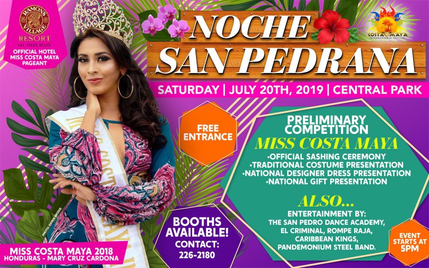 We invite everyone to be a part of NOCHE SAN PEDRANA – A street affair! On this night, the delegates from the Central American countries and Mexico vying for the title of Miss Costa Maya 2019 will be presented with their official sash and they will be presenting themselves in their traditional costume, a dress by a designer of their country and lastly, a national gift – all of this will be judged and be a part of the Preliminary Competition.