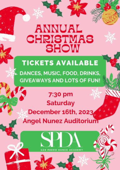 et into the festive groove with us at the San Pedro Dance Academy’s Annual Christmas Show! Join us on Saturday, December 16th, 2023, at the San Pedro High School Auditorium, starting at 7:30 PM (doors open at 6 PM). ![]()