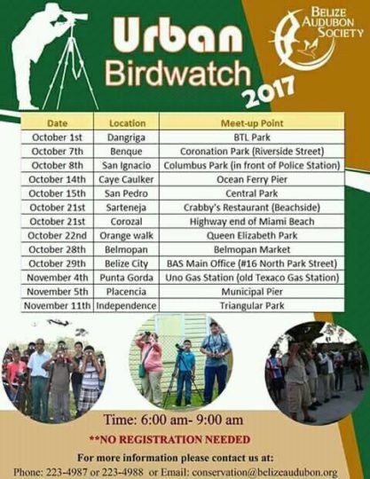 The Urban Bird Watch is an outdoor birding activity started by the Belize Audubon Society in 2009. Since then, this citizen science event has gained popularity, becoming BIGGER and BETTER with each year! This year, we’ll be traveling to 13 locations to observe the birds of Belize. Join us at 6 a.m. sharp at each meet-up location – no registration needed. Please note the Orange Walk location is the Central Park, also known as the Queen Elizabeth Park near the Town Council.