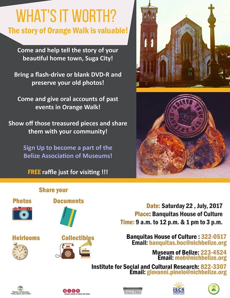 Coming to Orange Walk this Saturday, July 22nd……bring your old photos, treasured antiques, and stories to the Banquitas House of Culture. The images and stories you contribute will be told in the upcoming book titled “A Walk Through Orange Walk”. This is an initiative of the Institute for Social and Cultural Research (NICH), in partnership with Museum of Belize, Banquitas House of Culture, and The National Heritage Library.