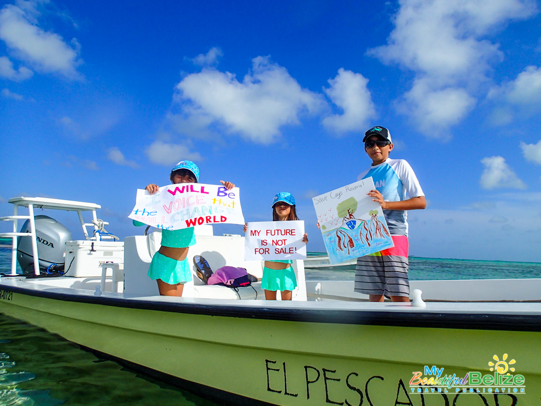 These cuties were just a few of the island residents who joined in the flotilla rally to send a message to developers who have proposed a tourism project that will include 40 over-the-water structures at the southern tip of Cayo Rosario, just west of Ambergris Caye.
