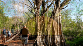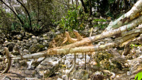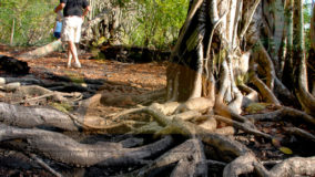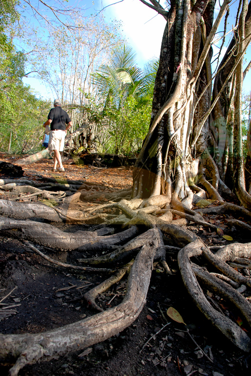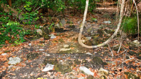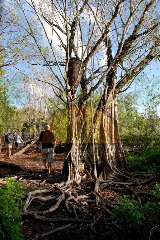 As one flies onto the island, Marco Gonzalez becomes very noticeable as the site’s distinctive vegetation clearly indicates its boundaries; rich green vegetation and towering trees ringed by marshland and mangroves. A 30 – 45 minute golf cart ride south of the airstrip takes you to the gateway to Marco Gonzalez. This approximately eight acre site, located south of the island, has been visited by the islanders and visitors for decades.