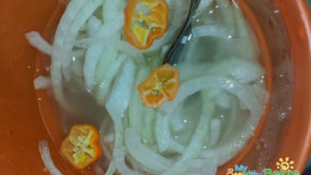 Pickled onions: dice ¾ pound yellow onions and place in container. Add water to slightly cover the onions, then add lime juice, salt and (if you’re daring) sliced habanero peppers to taste.