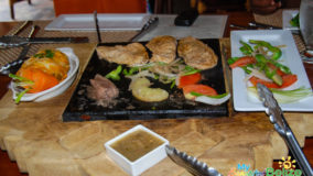 The next dish was the long anticipated Steak on a Stone. Jorge brought over a huge wooden tray with a smoking hot stone on the center. Thin strips of Belizean steak and chopped veggies were offered on the side for us to grill to our likeness.