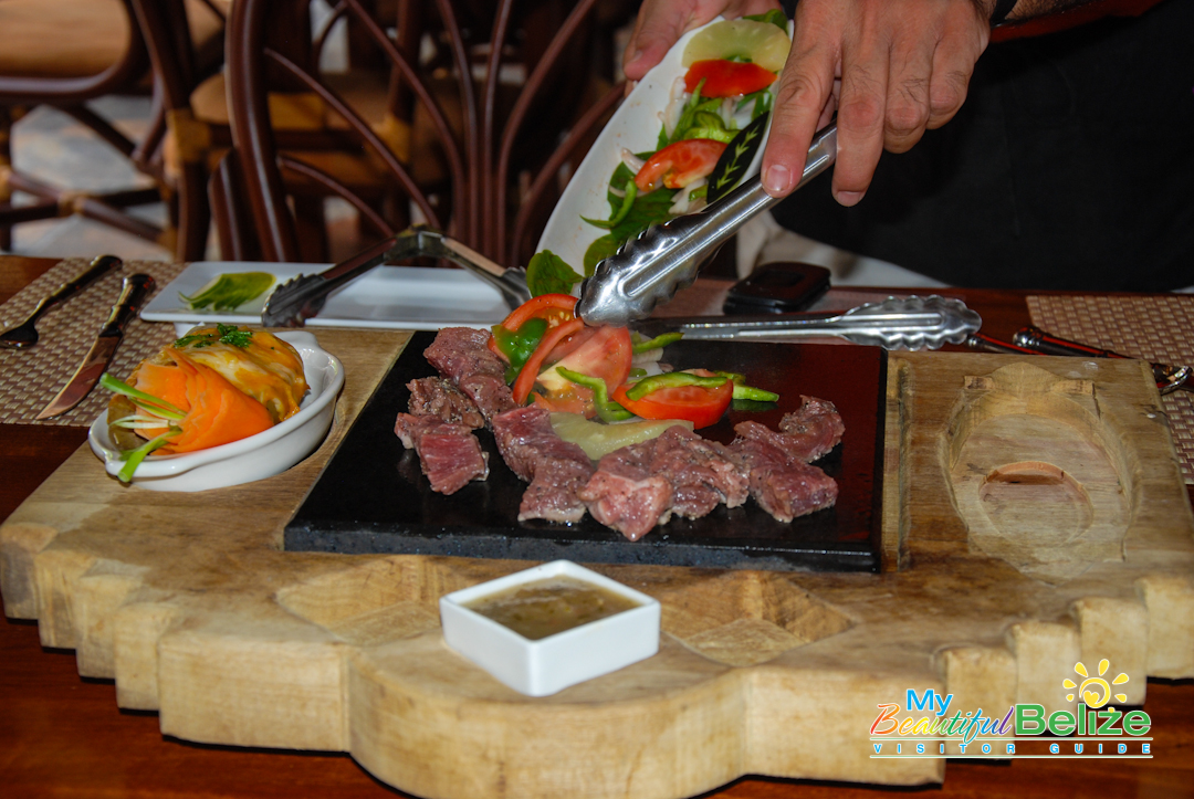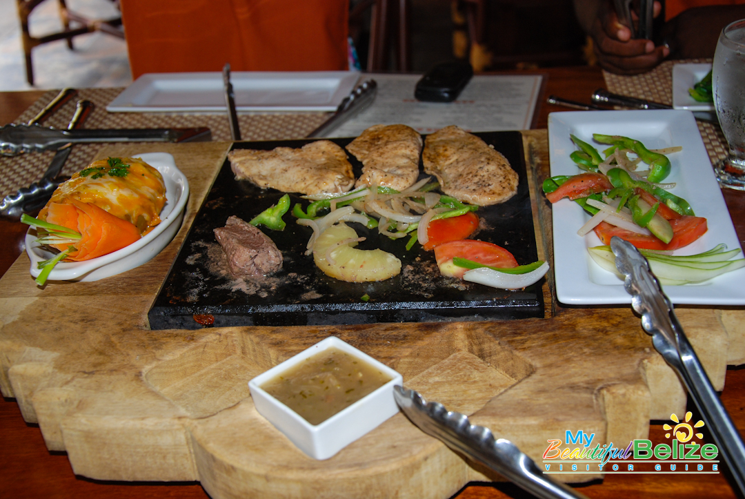The next dish was the long anticipated Steak on a Stone. Jorge brought over a huge wooden tray with a smoking hot stone on the center. Thin strips of Belizean steak and chopped veggies were offered on the side for us to grill to our likeness.