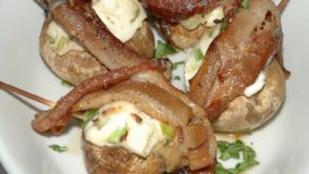 The mushrooms arrive first – and we get ready to dig in. Even if you aren’t a fan of mushrooms, it’s really hard to resist a fresh mushroom stuffed with cream cheese, wrapped with bacon and grilled/seared to a delicious crisp. The bacon adds tons of flavor and the earthy mushrooms are the perfect receptacle for the creamy cheese and bacon fat – what a delicious ‘healthy’ bite.
