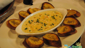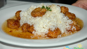 Three main dishes arrive as we’re polishing off the appetizers, our taste buds quivering in anticipation of the culinary delights that await us. A beautiful Lasagna Boat, tempting Spicy Shrimp in sweet-hot sauce and two glorious hunks of red meat (Ribeyes) grace our table. Where to begin?