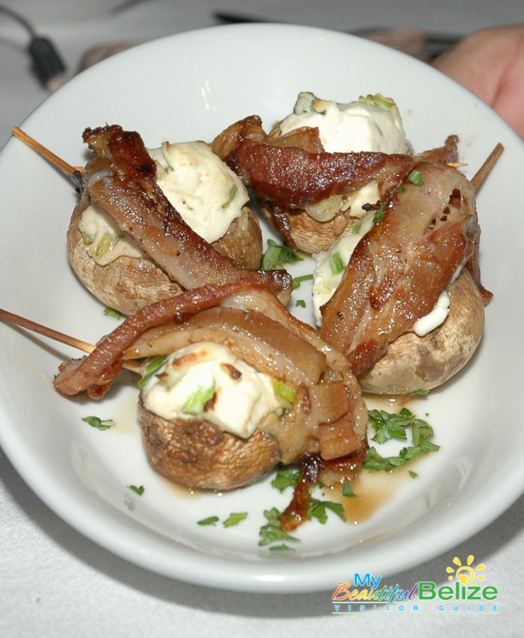 The mushrooms arrive first – and we get ready to dig in. Even if you aren’t a fan of mushrooms, it’s really hard to resist a fresh mushroom stuffed with cream cheese, wrapped with bacon and grilled/seared to a delicious crisp. The bacon adds tons of flavor and the earthy mushrooms are the perfect receptacle for the creamy cheese and bacon fat – what a delicious ‘healthy’ bite.