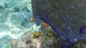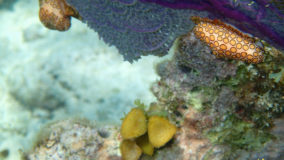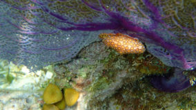 Sexual reproduction occurs between adults when a male approaches a female and crawls up onto the right side of her shell. Here, the male extends a white tube under the edge of the female’s shell and begins mating. After up to four hours of mating and four days, the female will lay encapsulated white translucent eggs onto the bare axis of soft corals, which is exposed from the snail’s feedings. It is believed these areas are chosen since there is an absence of the coral’s tissue toxins. Since each egg capsule contains multiple embryos (up to 300), a speckled appearance is demonstrated. Even though laying eggs occurs approximately during a lunar cycle, females have been known to lay several egg masses within a single cycle. After about ten days, the capsules hatch and the young free-swimming larvae disperse to live and feed on the plankton. The larvae gradually metamorphose into juveniles, then adults.