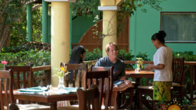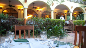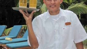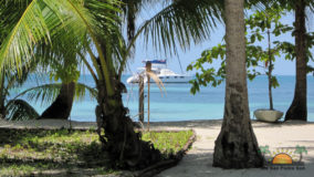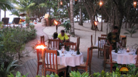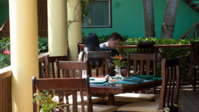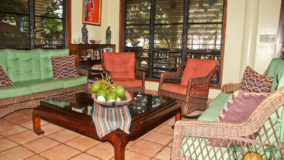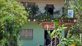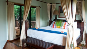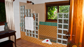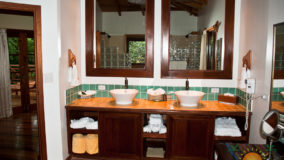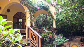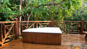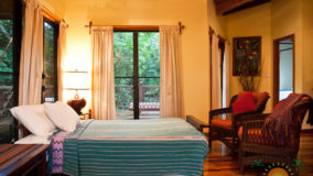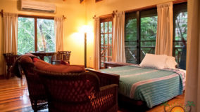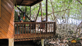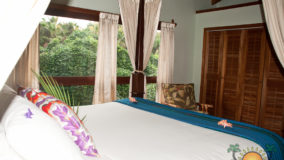 Front desk employee Rina introduces us to the compound and leads us along a short path to our jungle cabaña. The wooden home is high above the ground and nestled in the treetops of the jungle. Beautifully decorated and appointed with every convenience, we ohhh and awww as Rina shows us the kitchen area, master bedroom complete with a personalized welcome message written on a seagrape leaf placed on our pillow, a second bed arranged in the living area and expansive bathroom with a gorgeous gecko tiled onto the shower floor. Of course we are delighted when we discover the outdoor Jacuzzi on the tree-canopied porch, a perfect setting in the jungle yet so very close to the beach. It just doesn’t get any better than this!