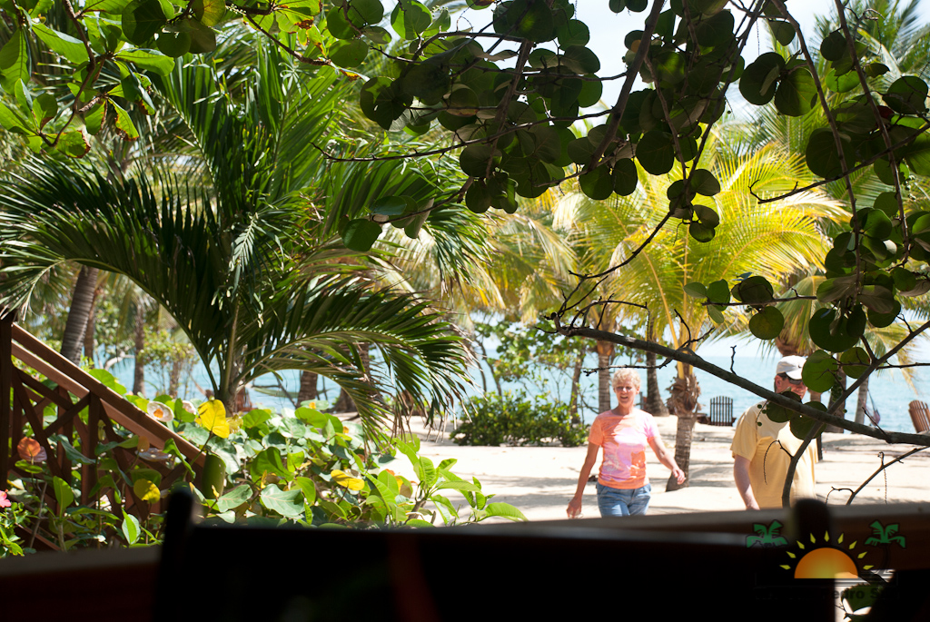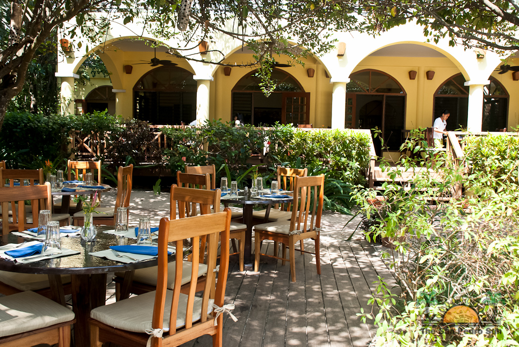 Front desk employee Rina introduces us to the compound and leads us along a short path to our jungle cabaña. The wooden home is high above the ground and nestled in the treetops of the jungle. Beautifully decorated and appointed with every convenience, we ohhh and awww as Rina shows us the kitchen area, master bedroom complete with a personalized welcome message written on a seagrape leaf placed on our pillow, a second bed arranged in the living area and expansive bathroom with a gorgeous gecko tiled onto the shower floor. Of course we are delighted when we discover the outdoor Jacuzzi on the tree-canopied porch, a perfect setting in the jungle yet so very close to the beach. It just doesn’t get any better than this!