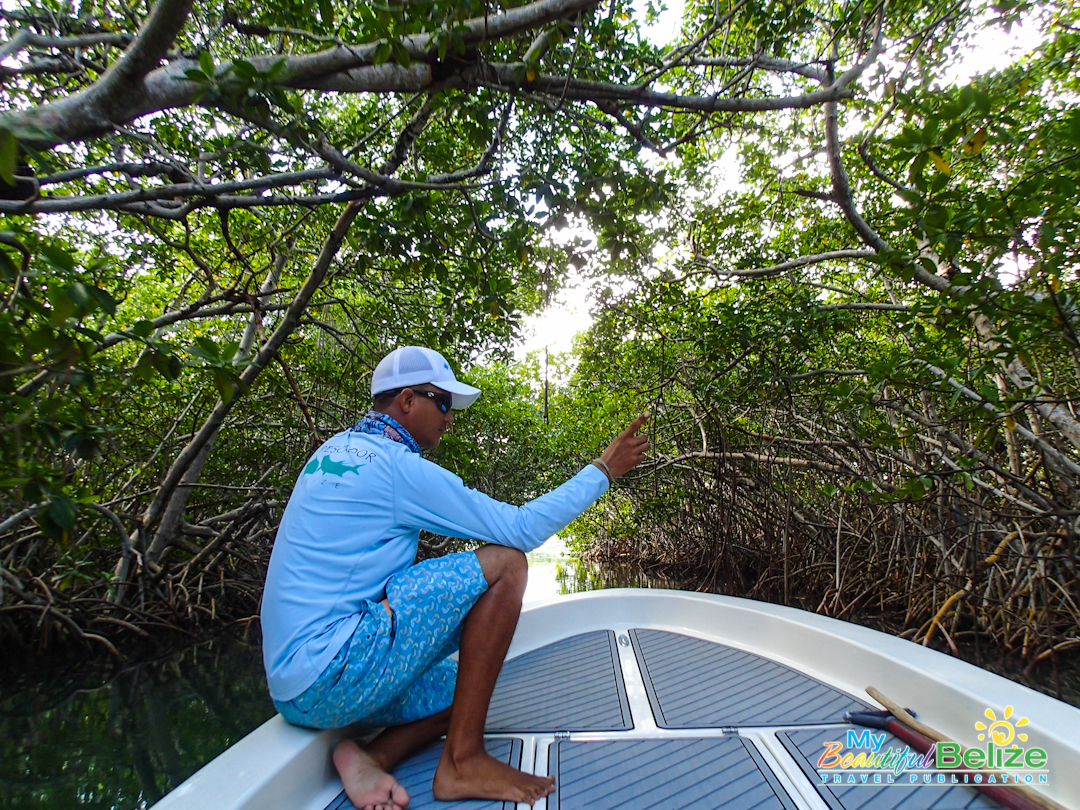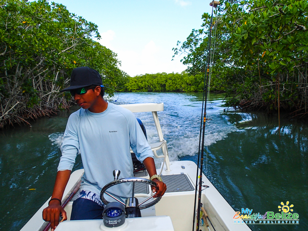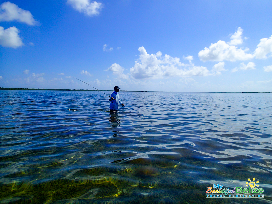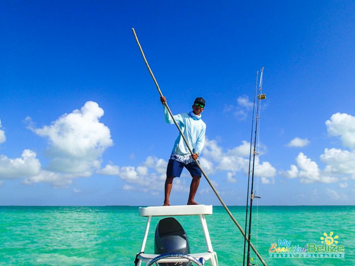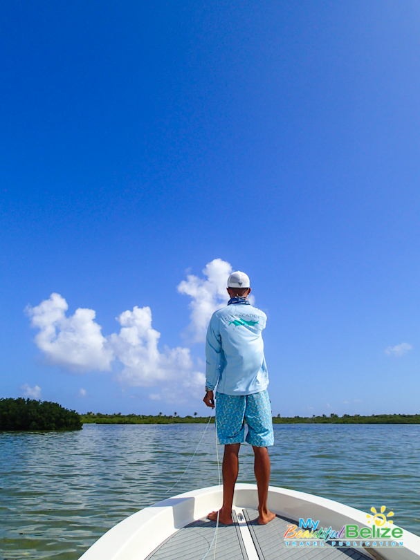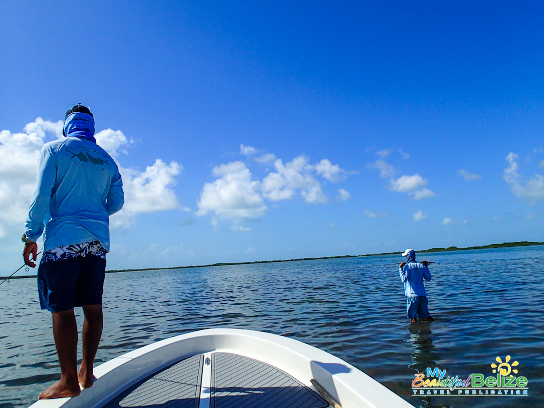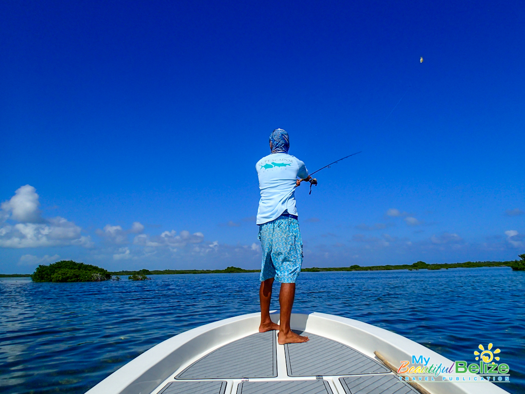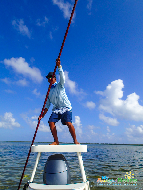 As the least experienced fisherwoman on earth, reef, deep-sea or flat, the entire day is a lesson. I’m amazed at the men’s keen sight and instinct. There is no doubt about it, their grace as they make their way around the boat, Captain Mike easily balancing on the platform as he poles gently through the low waters in the Bacalar Chico area.