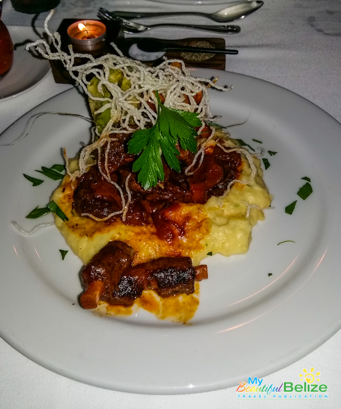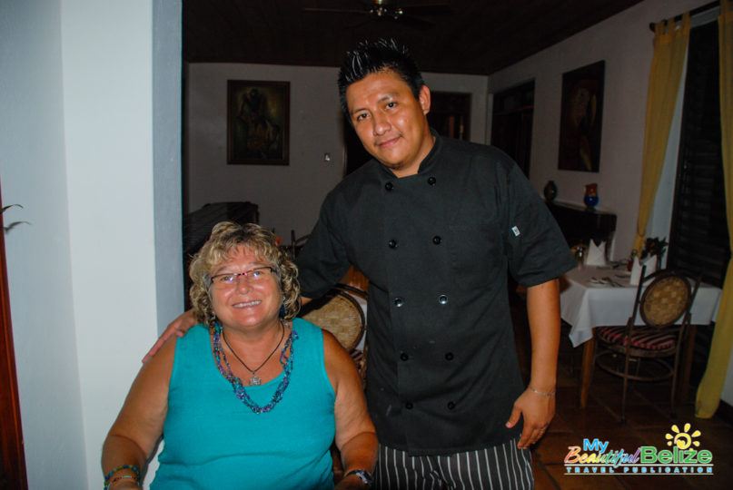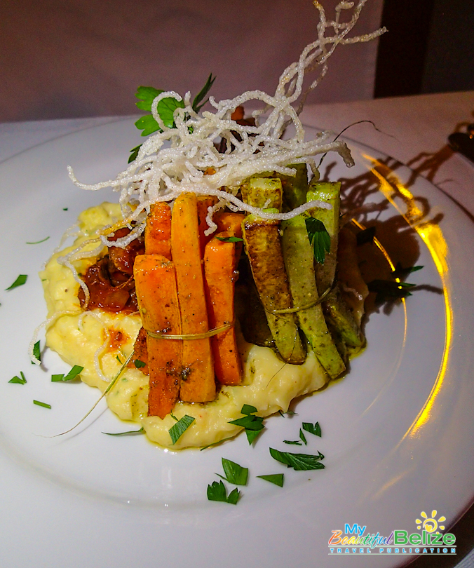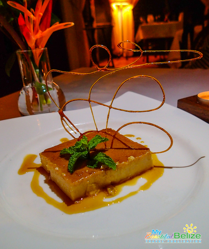 As guests at Hidden Valley Inn one evening we dine on Garifuna Cere Soup, Empanadas Mestizo style, and choose our entries from Blackened Grouper filet, Ox-tail in a tomato base with garlic mashed potatoes and veggies, and Two-bean Vegetable Enchiladas. For dessert, we indulge in Rum Flan and shared a Fresh Fruit Platter. The food was beautifully presented and thoughtfully prepared with fresh flavors and local spice. We devoured every bite!