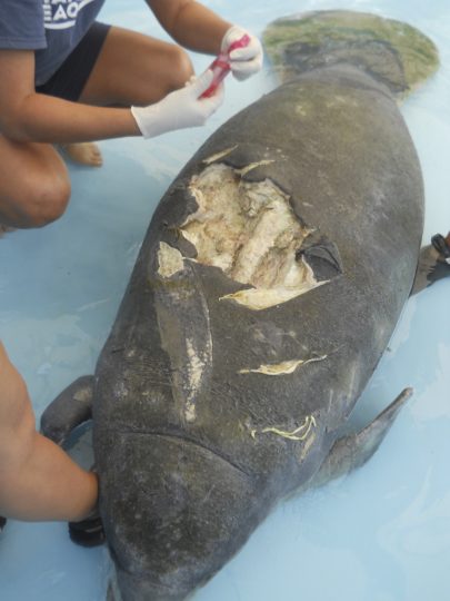 In 2005 Nicole Auil Gomez’s research concluded that there were approximately 1,000 Antillean manatees left in Belize. Once traditionally hunted by indigenous people, their numbers are now declining primarily due to boat strikes that cause death or injury when captains disregard the no-wake zones in manatee habitats. Habitat degradation, entanglement in fishing gear and poaching also contributes to their dwindling numbers.