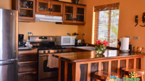 After delightful hours spent sharing a meal with great friends, we headed in to luxuriate in our expansive room. How wonderful to be able to have our own bed, with the wind howling around us, lightning striking and thunder booming, yet feeling absolutely ensconced and safe! One of us (ahem, Jorge) braved the elements to enjoy some breeze – and the cashews that had fallen along the pathway, and le boss enjoyed a few moments on the sofa just zoning out. I headed to my bed, stealing an extra pillow from my roommate to get extra cozy. Before I knew it, sleep had stolen in. When I next opened my eyes, it was morning, and time for coffee – which was available in the coffee station in the kitchen. With the first sip of that warm nectar, I wandered through the suite taking in the sights.