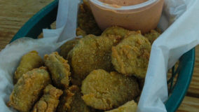 But enough talk of the atmosphere, it’s time for the main attraction: THE FOOD! Let’s talk about fried pickles. Yep, that’s right, fried pickles. Perfectly cut slices of premium pickles, lightly battered and fried golden brown. Dipped in a homemade smoked Chipotle sauce, and that crunchy, salty, sour, spicy goodness has us off to a delicious start!