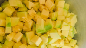 With my ingredients on hand, it’s time to get cooking! You can either leave the pumpkin with the skin or peel it- I like the skin on. After a thorough wash, deseed the pumpkin and dice up into small cubes.