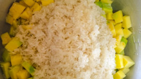 Once the rice is cooked and the pumpkin is tender, remove from the heat and mix in the condensed milk.