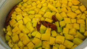 Then clean and wash the rice and place it in a pot with the pumpkin. Add enough water for the rice to cook through. Then add in the sugar and the cinnamon stick and put to boil for about 30 minutes.