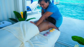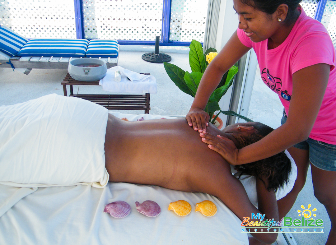 At Massage by the Reef, this fantasy manifested itself, and boy was I glad to be living every moment of it! Quite excited for this appointment, I walked the beach, making my way to Amigos del Mar, the dive shop where Massage by the Reef is also located. Strolling up on the dock, I made my way up the stairs to the private sky deck where I would be getting pampered for the next hour and a half. As I waited for my appointed time, I glanced around, completely taken away by the view that surrounded me. The turquoise waters of the marina glistened beneath me, off in the distance I watched as the never ending parade of waves rolled into the arms of the Barrier Reef, and kite surfers danced atop the warm Caribbean waters….what a view this was!