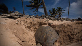 Research shows hawksbills can lay as many as 250 eggs. I couldn’t tell all that from my perch but I got goose bumps just from knowing it was happening just a few feet away. Minutes later the movement started again. This time, the mother used her flippers to cover the clutch of eggs. I am awestruck; this would be an arduous task for even someone with hands. The hole that took her almost an hour to dig is carefully covered within fifteen minutes. Slowly the turtle turns and drags herself across the beach and into the sea.