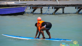 Determined, I get back on my knees, wanting to at least stand on the board, because it is apparent that gliding up and down the Caribbean Sea will not be happening in one lesson. Pam quiets down, or it could be the roaring in my ears, I don’t know which. I face the board, and in the least graceful way possible, try to find my balance. I close my eyes and place my hands flat on the front of the board, my feet planted firmly on either side, and despite the lapping of waves, and rocking motion, I let go and stand. For about 2 seconds.
