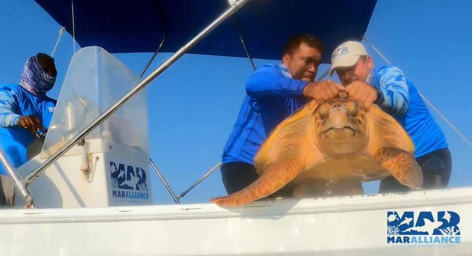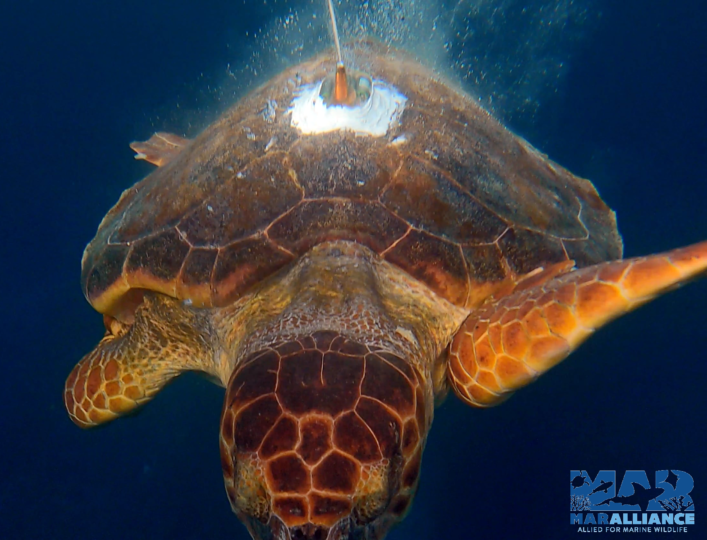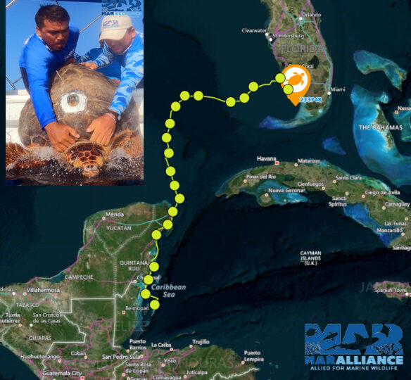 In May 2023, at the remote Lighthouse Reef Atoll, a critical moment unfolded in the ongoing saga of marine conservation. Peggy, a mature female loggerhead turtle, was gently captured in-water by the dedicated team at MarAlliance. This marked a new chapter in both her life and marine research. Fitted with a satellite tag, Peggy spent the following year mostly in the same location in the Atoll and then suddenly in late March 2024 she embarked on an epic journey from Belize towards the U.S., meticulously tracked to shed light on the secretive life of sea turtles. But Peggy is not just any turtle; she was named in honor of MarAlliance’s recently deceased Board Chair, Peggy O’Shaughnessy, a woman whose adventurous spirit and dedication to conservation continue to inspire.